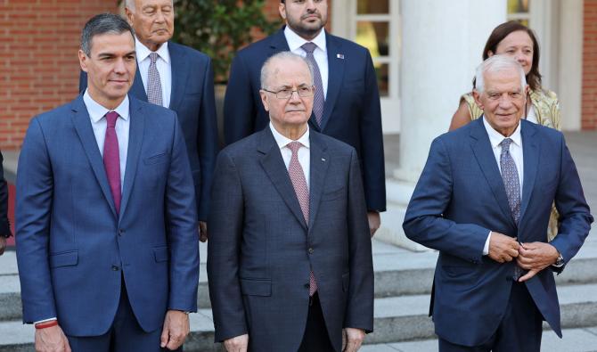 Le Premier ministre espagnol Pedro Sanchez, le Premier ministre palestinien Mohammed Mustafa et le responsable de la politique étrangère de l'Union européenne Josep Borell posent pour une photo de groupe avant une réunion sur une solution à deux États pour le conflit israélo-palestinien, au palais de La Moncloa à Madrid, le 13 septembre 2024. (Photo par Thomas COEX / AFP)