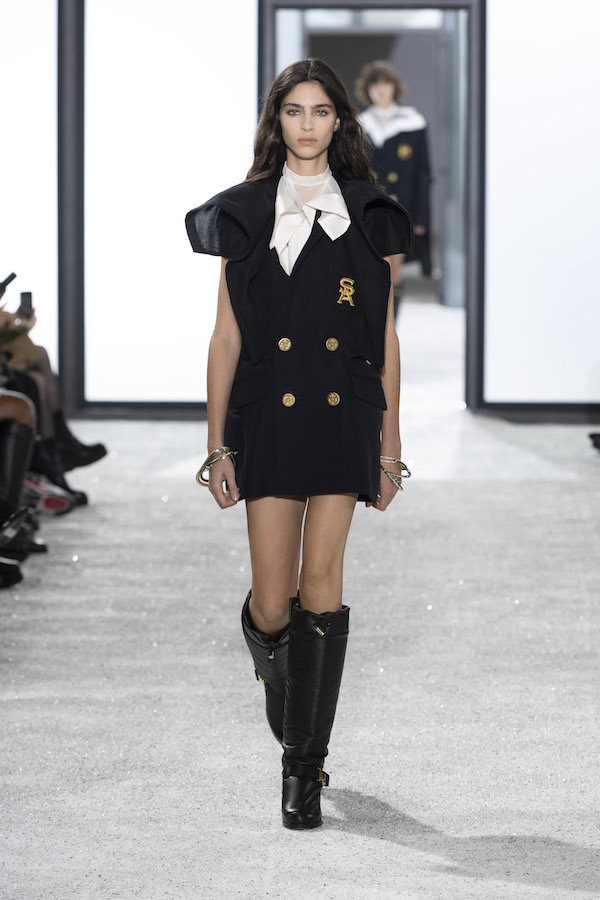 Elle portait une mini robe noire à double boutonnage, ornée de boutons dorés et d'un emblème brodé sur le côté gauche. La robe avait des détails exagérés au niveau des épaules, ce qui ajoutait du volume et une touche dramatique à une silhouette par ailleurs élégante.