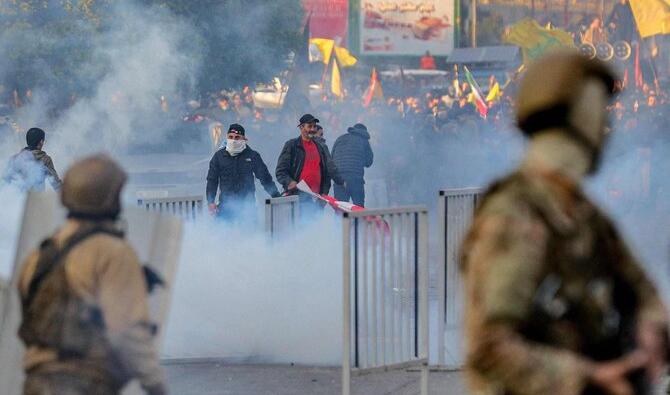 Des gaz lacrymogènes jaillissent lors d'affrontements entre des partisans du mouvement islamiste chiite libanais Hezbollah et l'armée libanaise lors d'un rassemblement organisé par le Hezbollah pour bloquer la route de l'aéroport international de Beyrouth suite à la décision d'interdire l'atterrissage de deux vols iraniens, à Beyrouth, le 15 février 2025. (AFP)