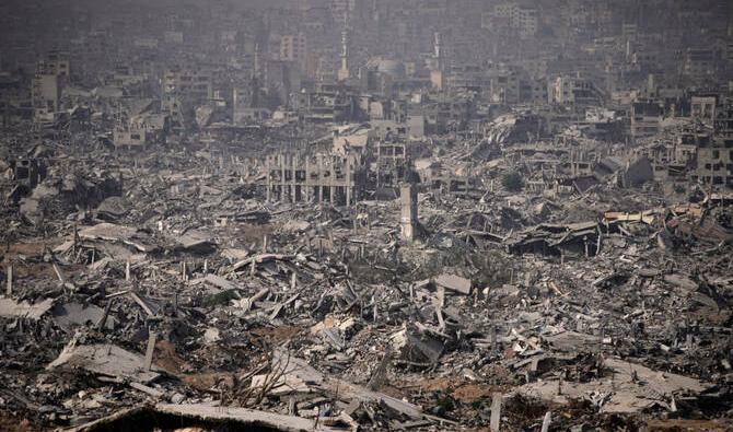 Des bâtiments détruits par l'armée israélienne  dans le quartier de Shijaiya de la ville de Gaza, lors d'une visite organisée par l'armée pour les journalistes, le 5 novembre 2025. (AP Photo)