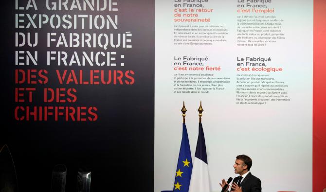 Le président Emmanuel Macron prononce un discours lors de l'inauguration de l'exposition « Fabrique en France » à l'Élysée, à Paris, le 25 octobre 2024. (AFP)