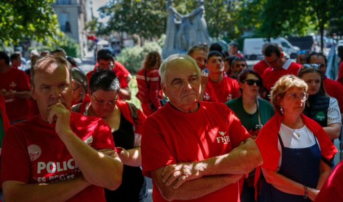 Des agriculteurs et des membres de la Fédération nationale bovine manifestent près de l'ambassade du Brésil à Paris le 9 juillet 2025 pour montrer leur opposition à un éventuel accord de libre-échange entre l'Union européenne (UE) et le Marché commun du Sud (MERCOSUR). (AFP)