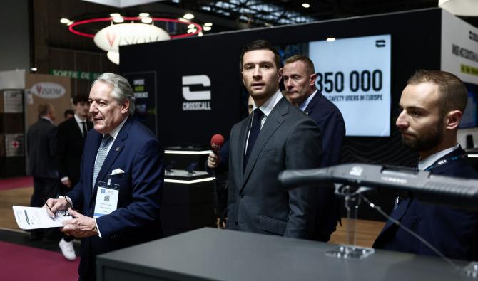 Le président du parti d'extrême droite français Rassemblement National (RN), Jordan Bardella (au centre), visite la 24e édition du salon mondial de la sécurité intérieure MILIPOL PARIS 2025, le 19 novembre 2025. (AFP)