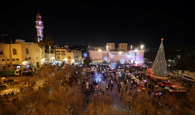 Par solidarité avec les Palestiniens du territoire, les festivités avaient été annulées mais cette année, avec la trêve entrée en vigueur à Gaza en octobre, l'immense sapin de Noël s'est de nouveau illuminé devant la basilique de la Nativité, construite sur la grotte où la tradition chrétienne situe la naissance du Christ.