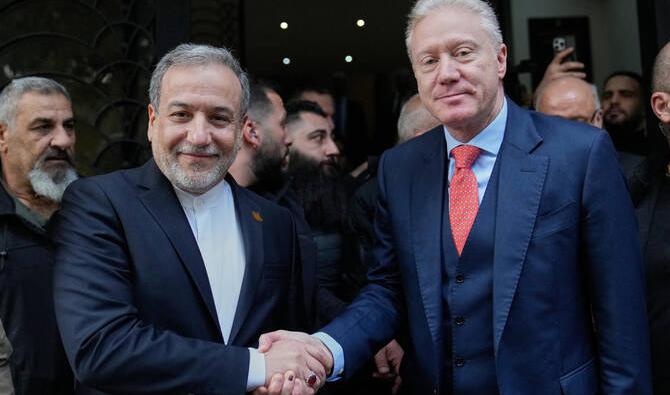 Le ministre libanais des Affaires étrangères, Youssef Rajji, serre la main de son homologue iranien, Abbas Araghchi, à Beyrouth, le 9 janvier 2026. (AP)