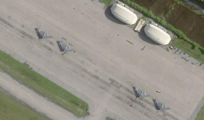Cette image satellite de Planet Labs PBC montre quatre bombardiers furtifs B-2 stationnés à Camp Thunder Cove, sur l’atoll de Diego Garcia, le samedi 29 mars 2025. (AP)
