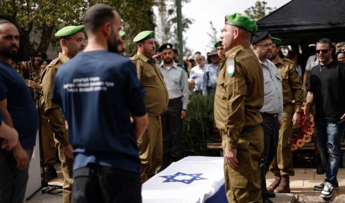 Les camarades du sergent-major (réserve) Ayal Uriel Bianco, qui aurait été tué au combat dans le sud du Liban, se tiennent au garde-à-vous devant son cercueil recouvert du drapeau lors de ses funérailles à Katzrin, dans le plateau du Golan annexé par Israël, le 14 avril 2026. (AFP)