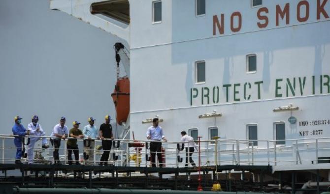 Les travailleurs de la compagnie pétrolière publique vénézuélienne PDVSA regardent le pétrolier battant pavillon iranien Fortune accoster à la raffinerie El Palito à Puerto Cabello, Venezuela, le 25 mai 2020. (AFP)