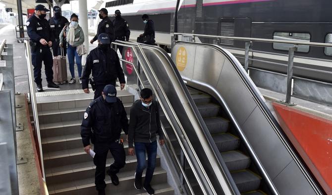 "Des agents de la Police Aux Frontières (PAF) escortent des voyageurs vers la frontière espagnole après avoir inspecté leurs documents près d'un TGV en provenance d'Espagne à la gare de Perpignan, dans le sud-ouest de la France, le 13 novembre 2020. (RAYMOND ROIG / AFP)