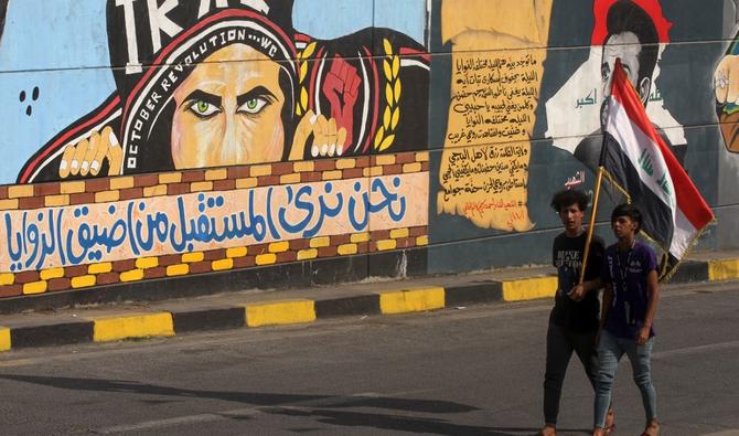 Des jeunes irakiens portent un drapeau national alors qu'ils passent devant une peinture murale sur la place Tahrir de la capitale Bagdad. (Photo, AFP)