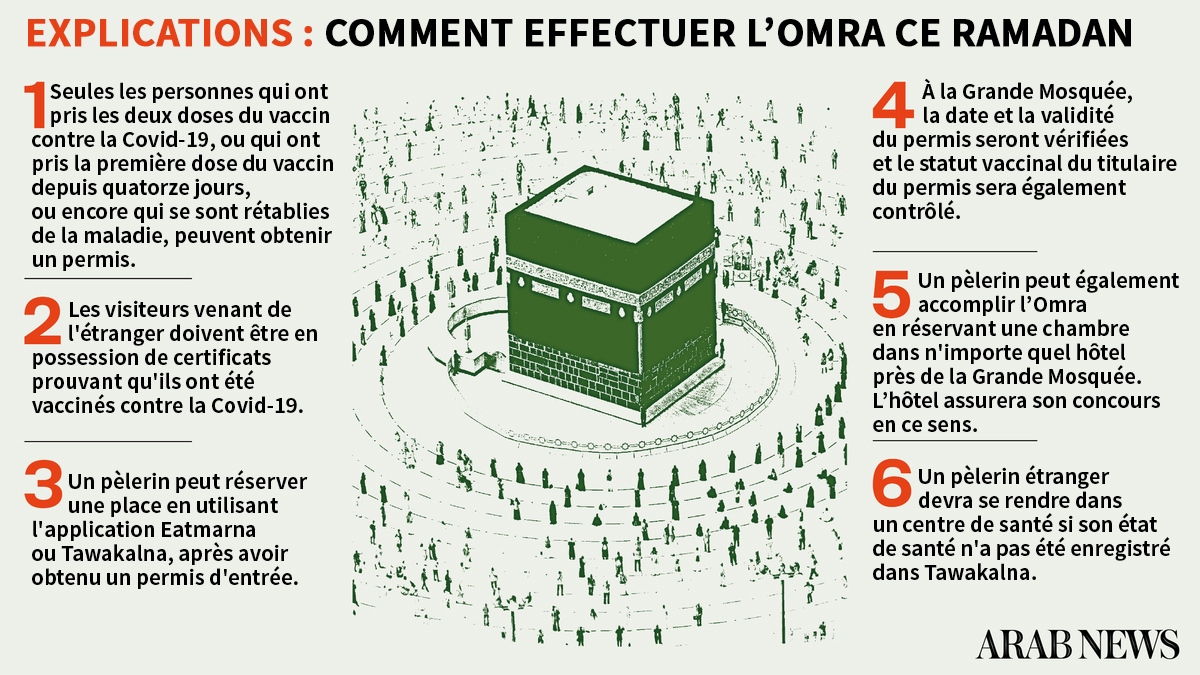 DJEDDAH: Le ministère saoudien du Hajj et de l’Omra a annoncé les directives pour la délivrance des permis de prière et de l’Omra pour le mois du ramadan. Les vaccinations figurent en tête de la liste des priorités, et aucun fidèle ne peut pénétrer dans la Grande Mosquée de La Mecque ou dans la mosquée du Prophète à Médine sans avoir reçu au moins une dose de vaccin contre la Covid-19.