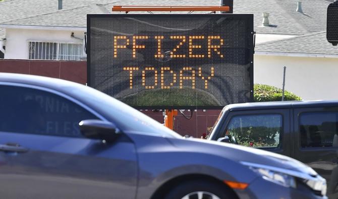 Des automobilistes passent devant un panneau annonçant « Pfizer Today » disponible sur le site de vaccination Covid-19 de Cal State à Los Angeles, Californie / AFP