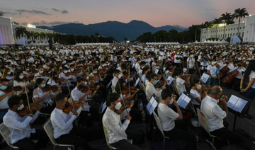 Les musiciens du Système national d'orchestres pour la jeunesse du Venezuela, issus de tout le pays, se sont réunis dans la cour de l'Académie militaire du Venezuela à Caracas